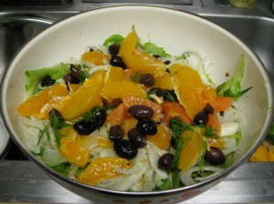 Pour greens into a large bowl. Drain fennel and place on top, orange segments next, then the olives, and finally the torn fennel tops. Pour about 3 T of good extra virgin olive oil , a sprinkling of good salt (like fluer de sel) and pepper to taste. Squeeze the remaining juice from the pith all over salad and then toss. If there’s not enough juice leftover, add a splash of sherry vinegar.