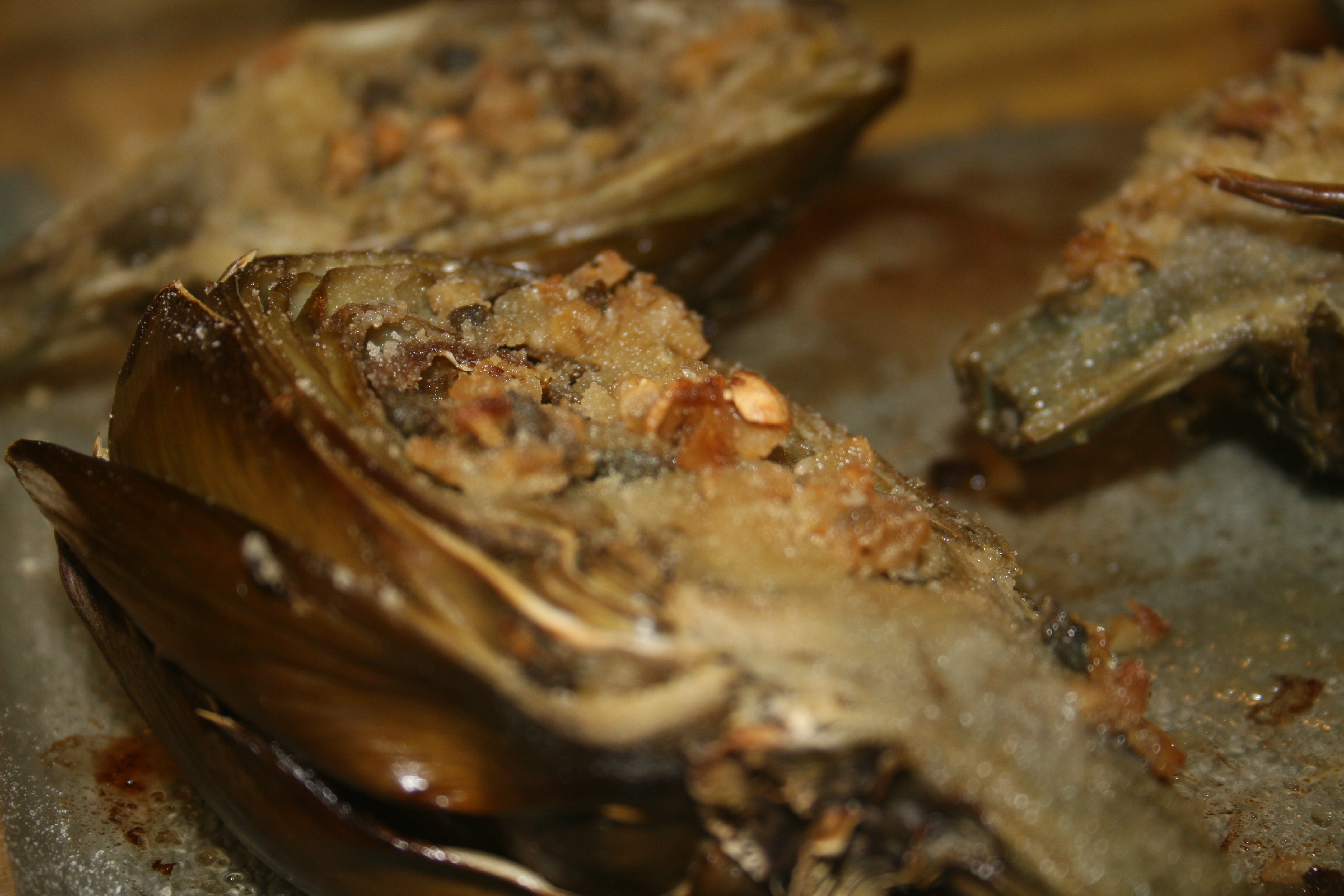 Preheat oven to 400. Saute garlic, anchovies, and chili flakes in 2 T olive oil for about 2-3 minutes, until fragrant. Add capers and parsley. Saute for another minute. Remove the artichoke from the water and pat dry. Rub olive oil all over them to coat. Lay them cut side up and sprinkle the garlic mixture on top of each half, and rub in with your fingers so it goes between the leaves in some spots. Throw a dash of salt over everything.