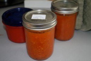 Saute the onions and carrots in 2 TBSP olive oil until soft. Do not let brown. Add the quartered tomatoes and whole garlic cloves (for a more garlicky sauce, chop and add a little later- but I do that as a variation from the jar of this plain stuff). Cover partially and cook over low-medium heat until completely soft, about 45 minutes-1 hour. Now you have 3 options: