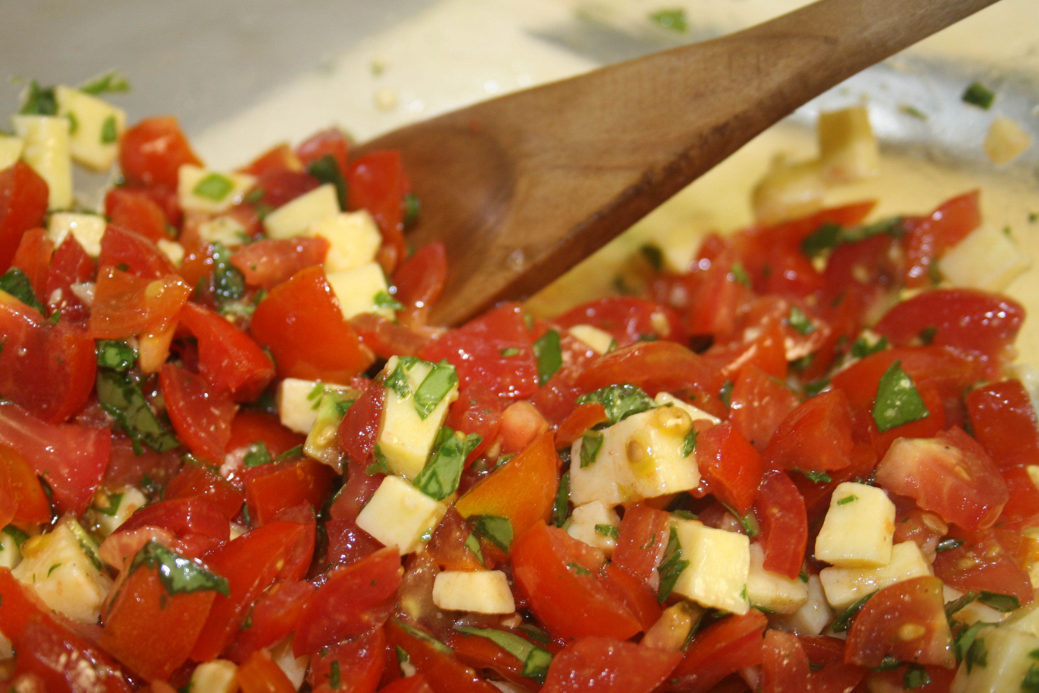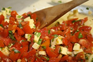 Cut tomatoes along the equator and use your finger to get out most of the seeds. But don’t worry too much and leave some. Dice tomatoes and place in a large bowl. Chop garlic very finely and add to tomatoes. Add olive oil, a pinch or 2 of salt, and the cheese and basil. Cover with plastic wrap and let sit for 1-2 hours.