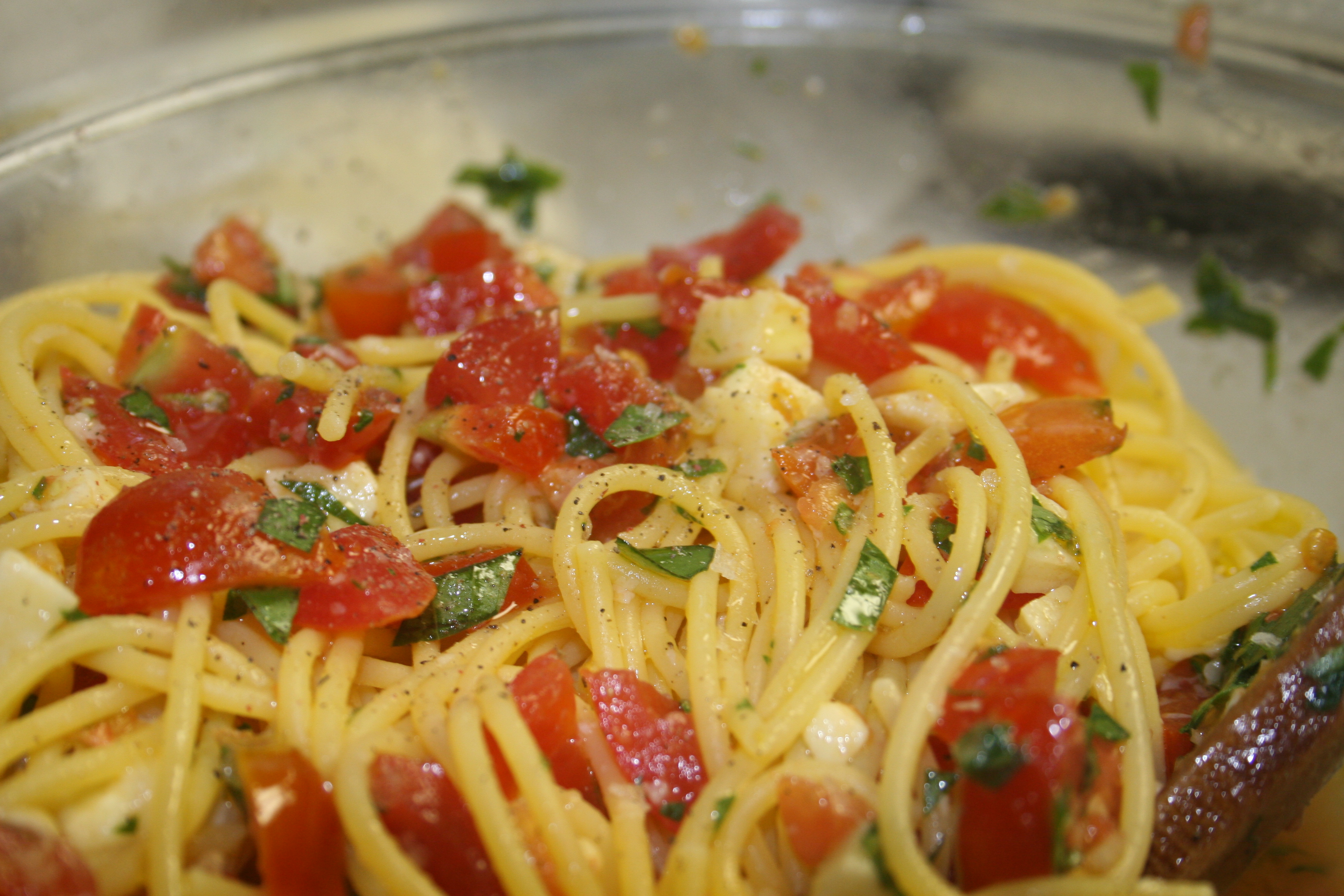 I grew up in a neighborhood called Rustic Canyon where every Monday night from Memorial Day to Labor Day, there is the famed “Monday Night Picnic.” Okay, it’s not famous. It’s a huge potluck at the park across the street from my parents’ house. Some weeks there are loads of families and friends and some weeks there are few. One of my very favorite Monday Night Picnic dinners is a pasta my mother makes with tomatoes, mozzarella, and basil. She does it in a way that I can’t say I see very often. The best part? Picking at it out of the fridge the next day. If you are going to make this, the only trick is- you have to have the very best ingredients. Do not attempt to make this with regular ol’ store bought tomatoes. The other special thing is that this it totally raw, no cooking of the tomatoes. Pouring the hot pasta onto the mixture causes the cheese to melt oh so perfectly.