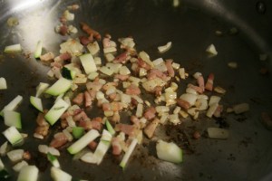 Saute the pancetta in a large pot until the fat just starts turning translucent. Cut the squashes in half lengthwise, and make a slash with your knife around the seeded parts and remove. Don’t be too finicky about this!