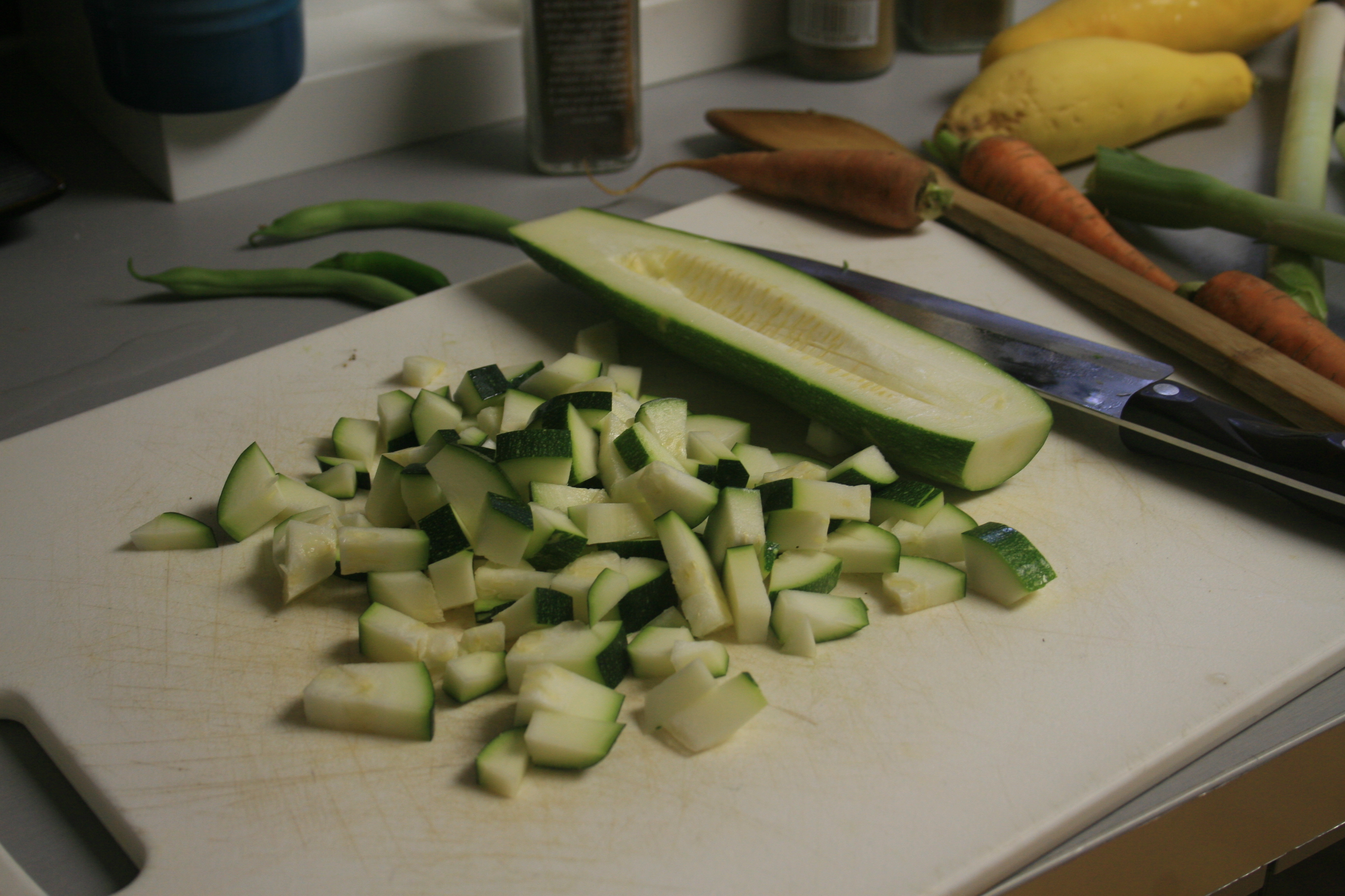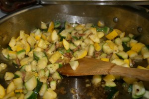 Add the crookneck, 1/2 of the onion, and the zucchini. Saute until tender. Remove from pan and set aside for later. Next, saute the leeks, the remaining half onion, and the carrots until tender, over low heat. Don’t let brown.