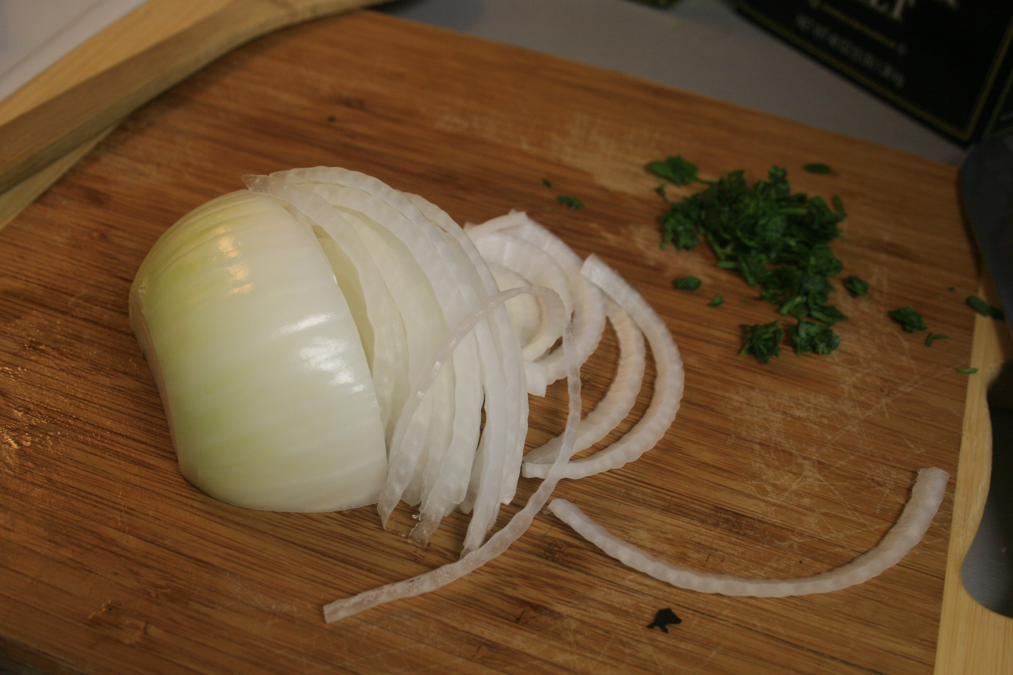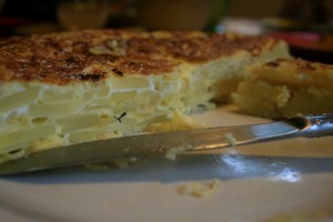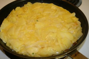 Slice the potatoes and onions really thinly. If you have a mandolin, even better. In a 9-in non-stick tefflon pan, pour enough oil to soon cover the sliced potatoes. Poach the potatoes and onion in the olive oil, simmering, and turn (stir) once or twice. Cook until done completely. Strain the oil out and reserve a few tablespoons of it. Whisk together 4-5 eggs with a hefty pinch of salt and pepper. Add the potatoes into the egg mixture and let rest in the large bowl for about 15 minutes.