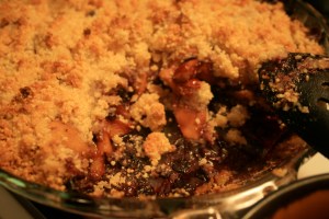 Preheat oven to 350 and grease a pie pan. Slice peaches into 1/8ths and place in the pan. Put blueberries, tapioca/arrowroot, and lemon juice in with the peaches and mix it up with your hands until it’s completely incorporated. In a separate bowl, mix all dry ingredients for the topping. Spread the topping evenly over the top of the fruit mixture in the pan. Pour melted butter, a little at a time, over the top. It does not all need to get covered, but should be evenly spread out. Use a fork to mix it up and spread the wet parts around.