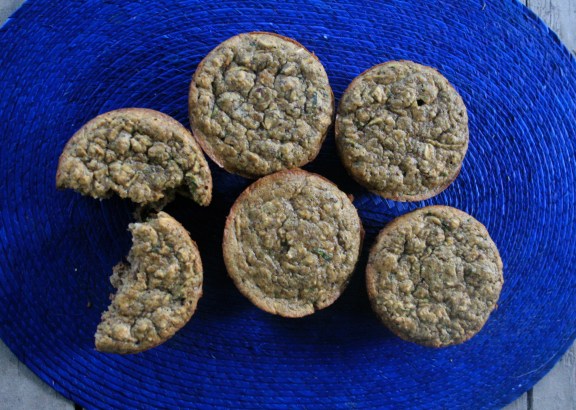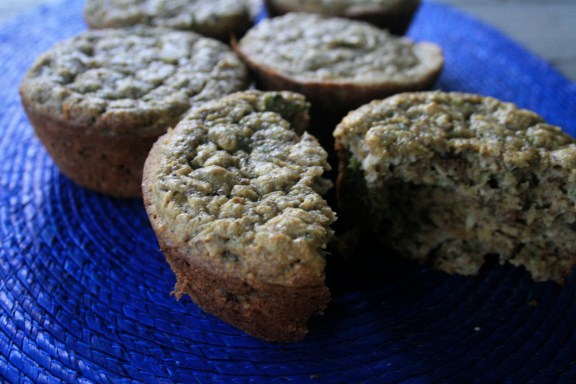 Preheat the oven to 325. Grease 6-8 large muffin tins. Grate the zucchini in the food processor or on a box grater. Set zucchini in a colander over the sink to let excess liquid drain out. In the food processor, blend the almonds, oat flour, salt, baking soda, and rice flour until pulverized.