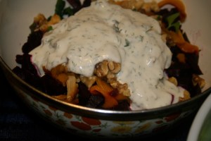 Pour batter into a large bowl and fold in the chopped raisins and the remaining 2 cups of carrots. If your food processor bowl is large enough to do this, then don’t bother dirtying another bowl! But mine is too small. Pour batter into greased pan(s) and bake for 35-40 minutes. Let cool completely before frosting.