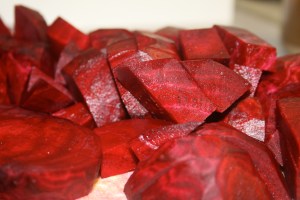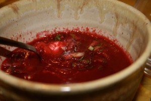 Add the beets to the onions and continue to cook over low heat. Add 4 cups of the reserved beet juice and 1 cup of water. Add 2 T of sugar and a splash of red wine vinegar. Cover the pot and cook down over low for a few minutes. When all is very tender, blend all ingredients. I use my handy dandy hand-held immersion blender. Chill soup in the fridge for at least 8 hours. I was impatient, and stuck it in the freezer with a bunch of ice cubes. Don’t do that.