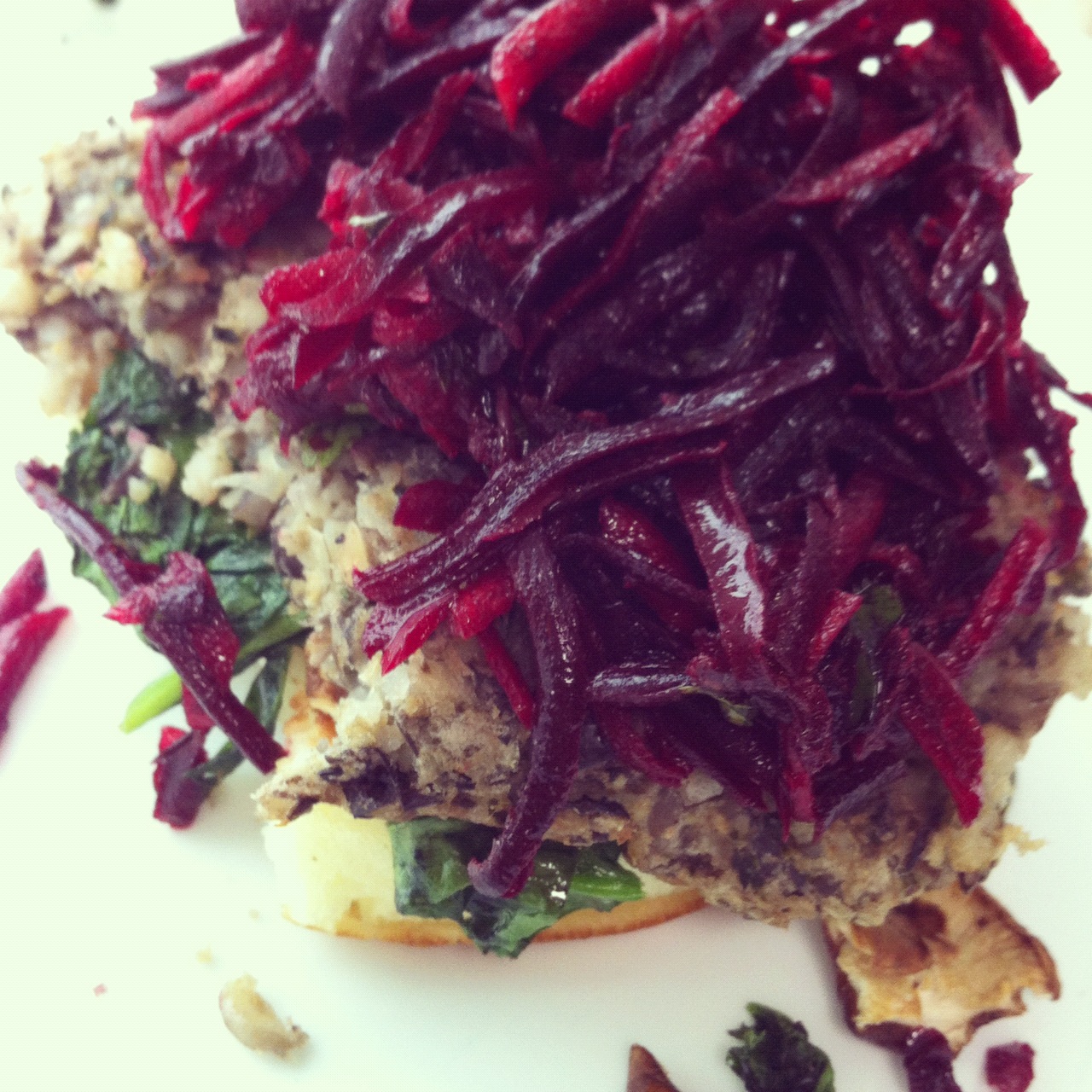 Since all of the ingredients are pre-cooked, it will be fine if you can’t bake these at the office. Microwaving them causes them to fall apart, but the mush is acceptable. I put mine in the toaster oven at work and toasted each side for just a couple of minutes. There is no extra binding ingredient in these, so they are delicate. The one pictured here is on a gluten free crumpet, layered with sauteed spinach and shitaki mushrooms and topped with the beet and carrot slaw. Made a delicious lunch.